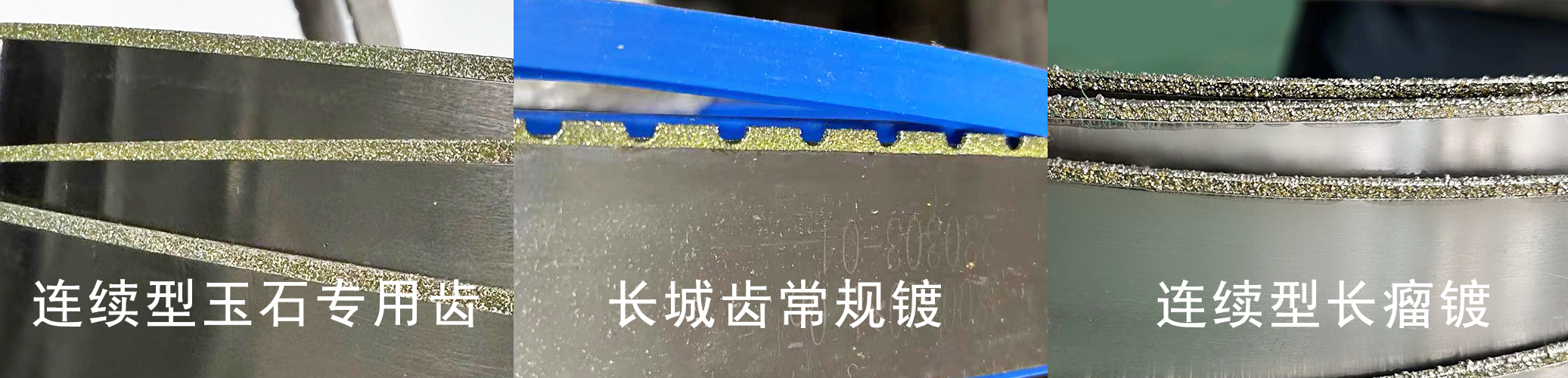 金剛砂帶鋸條常用齒型有:長(zhǎng)城齒、長(zhǎng)城齒長(zhǎng)瘤鍍、間斷齒、連續(xù)齒、連續(xù)齒長(zhǎng)瘤鍍、連續(xù)半圓齒、連續(xù)型玉石專用齒等。