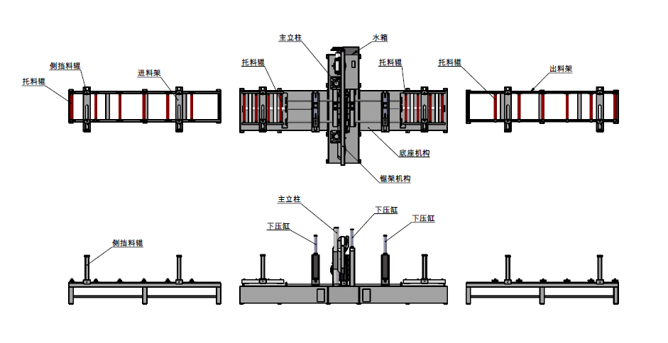 (6)鋸條前后各一套送料床臺,后床臺送到位后,如果還不到設定尺寸,再由前床臺往前拉,如果還不夠接著再由后床臺往前送,如此循環(huán),直至送夠所需長度開始鋸切。